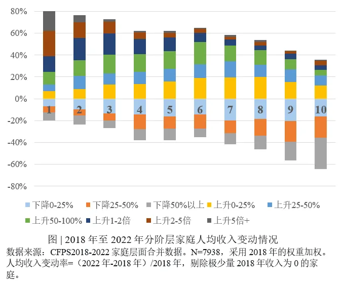 家庭收入阶层的变化是相对的,有人上升就必然有人下降。但阶层下降不一定意味着绝对收入的降低。因为我们还需要考查家庭绝对收入的变动情况。总的来说,2018年至2022年,中国家庭有近六成家庭收入增长,另外四成下降。如果将收入变动在25%以内视为收入相对稳定(因此造成的阶层变动一般在2层以内),那么收入处于稳定和上升区间的家庭总体占四分之三,收入越低的家庭,这个比例就越高。