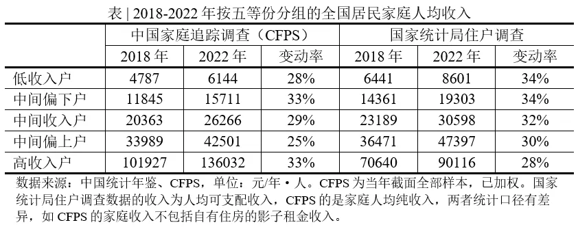 按收入高低将中国全部家庭分为5等分,无论是CFPS的数据还是国家统计局的住户调查,每等分的收入在2018年至2022年,都是持续提高,没有任何一个家庭组的平均收入是下降的。
