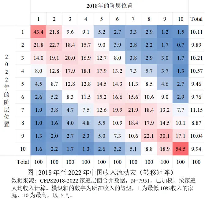 我们将阶层变动在上下各一个阶层内(即原阶层向上或向下流动1阶)视为留在本阶层,以此计算1-10阶层的稳定率(留在原阶层)。底层(1-2)和顶层(9-10)稳定性最高,他们有六七成的比例留在了本阶层,对于底层来说,这意味着向上流动相对困难,而对于顶层来说,他们易于维持自己的阶层。中间阶层(不同于本文讨论的中产阶层)流动活跃,仅有半数左右的家庭留在了本阶层,部分阶层提升,另一部分则滑出自己的阶层,显示其相对受挤压的状态。从流动表的色温还可以看到,收入阶层的流动主要是短程流动,上升或下降一般都在2-3格以内,超过4个阶层的比较少见。从流动表的色温看,左下角和右上角即从最低阶层跃升至顶层或顶层骤跌至底层,为蓝色意味着占比很小,也就是说一夜暴富或一夜致贫不是中国的普遍现象。