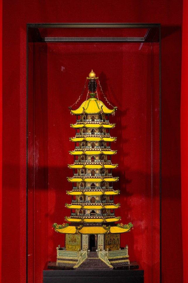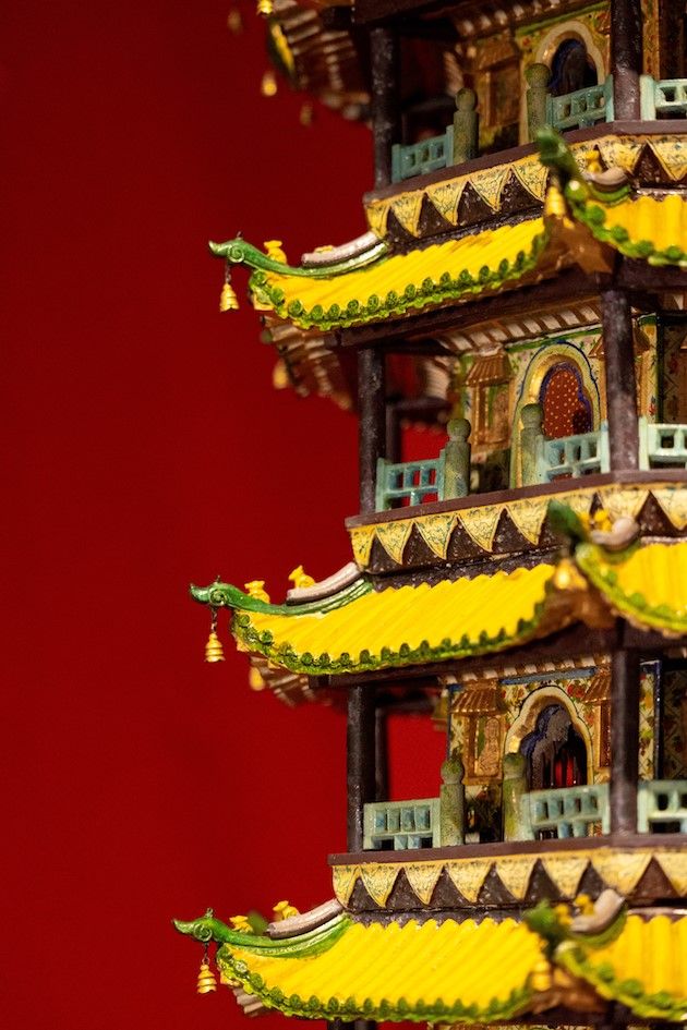 (大报恩寺琉璃宝塔的木制模型(局部))曾经的大报恩寺琉璃塔极尽奢华璀璨,已经无法再复制。令人惊喜的是,这座一百多岁的木塔依然历久弥新,保持了鲜活的色泽和精致的细节,连悬挂的垂铃都栩栩如生,令人惊叹。