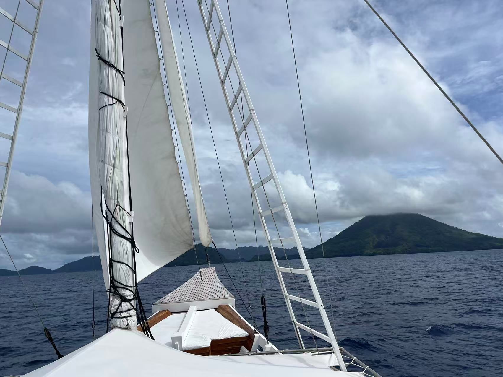 尽管行前有一个简单的行程说明,可是由于路线涉及到开放海域,海航天气不可预估,具体安排经常比较“即兴”。而这正是不喜欢刻板计划的我所喜欢的。事实上,从第二天开始我已经感觉得到,这将是一趟带着点探索与冒险气息的旅程。记得旅程刚开始的第二天,我们连夜穿行开放海域的班达海,海面黑得没有边界,只看见闪电在远处划开天空,船在深浪里轻微左右晃着。睡不着的轻微心悸之下,打开手机翻资料,也就学到了不少平常不会留意的知识:印尼中部的班达海,四周被苏拉威西、马鲁古、帝汶群岛环绕,中间是个最深可达七千米的海盆。这种“封闭深海”地形会使风浪反射叠加,形成一种不规则的交叉涌浪(swell),即浪向同时来自多个方向。处在季风交汇带上的班达海,深海、开放海域、风浪可能迅速变化,尤其是进入11月之后,风雨都不稳定。