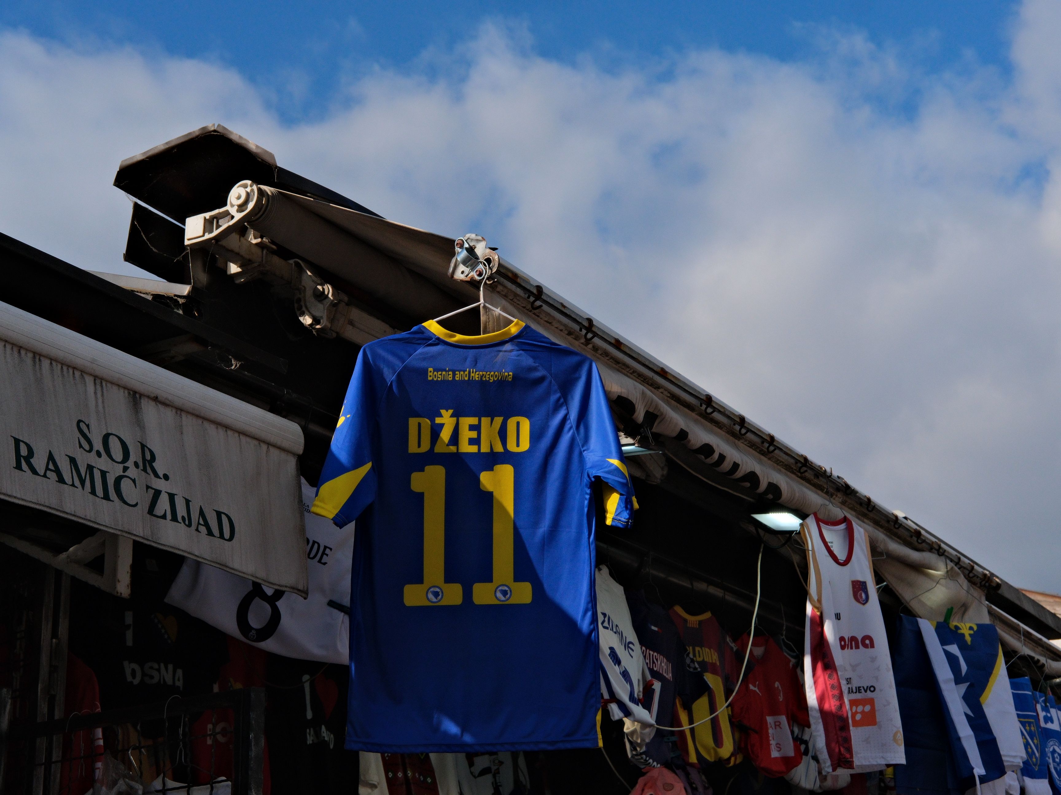 巴什察尔希亚集市售卖的埃丁•哲科球衣集市上四处可见埃丁•哲科(Edin Džeko)的球衣,他的球衣被与梅西和C罗并排挂在一起。这位克族波黑前锋有点像波斯尼亚的国家英雄。我一直认为哲科是一位被低估的球员,他的职业态度出众,竞技状态也一直维持得极好,最重要的是,他保持着很高的进球效率。