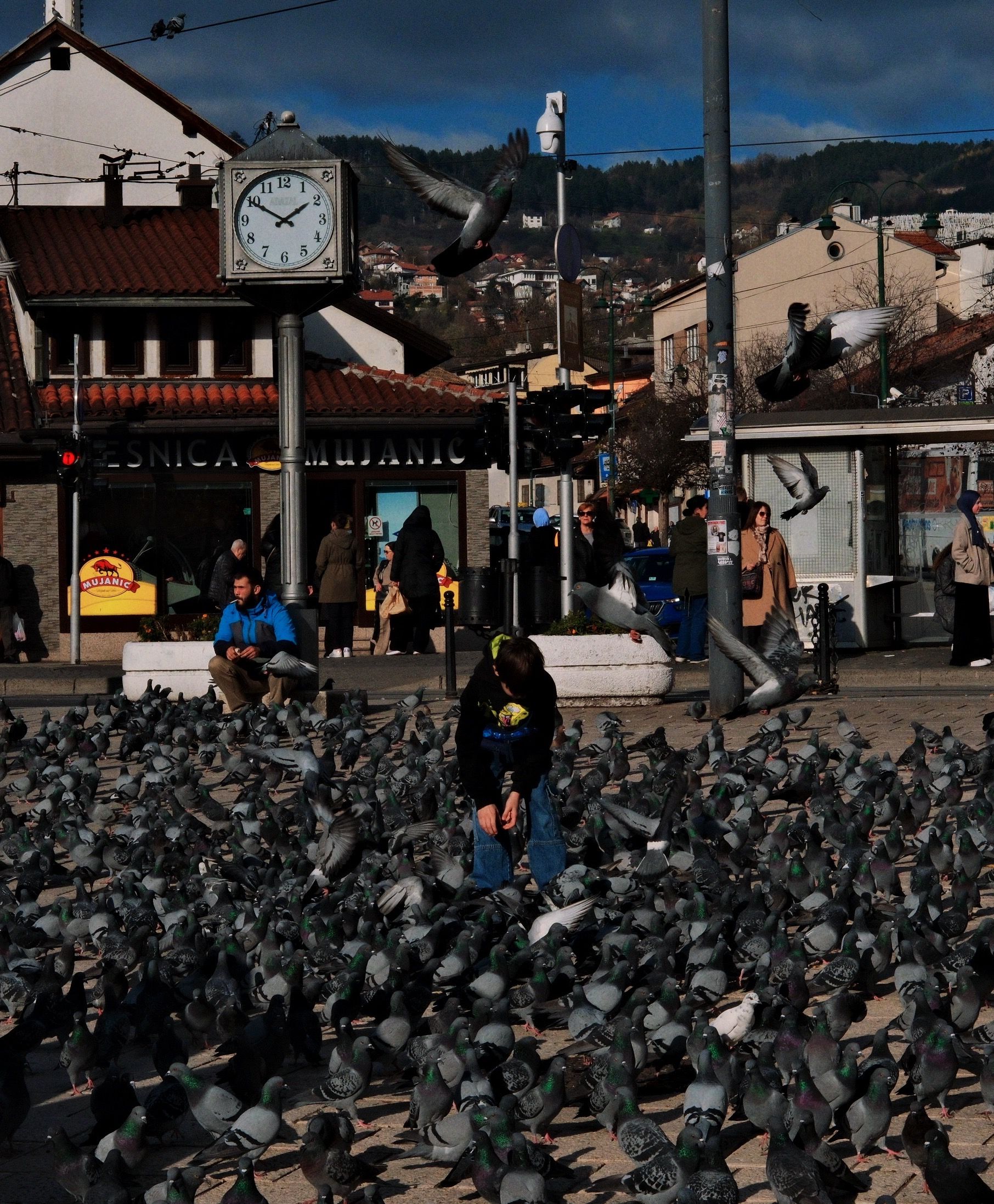 瑟比利喷泉旁的鸽子广场瑟比利喷泉(Sebilj Fountain)虽然名字叫喷泉,但它其实是一个奥斯曼风格的木质饮水台。几条并不宽阔的马路汇聚在“鸽子广场”,它们的交点就是瑟比利喷泉,这是萨拉热窝的凯旋门。无数的鸽子聚集于此,游客乐此不疲地给它们喂食。