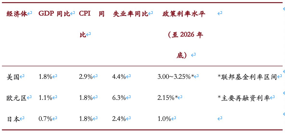 分化中的共振:全球经济增长新范式。从经济基本面来看,美国方面,投资与消费的内生动力已逐步放缓,未来随着库存周期回落和企业支出趋于谨慎,前置性动力逐步弱化可能使得需求增长面临一定压力。预计2026年美国货币政策回归中性利率水平,利率回落至3~3.25%左右,经济增速方面维持1.8%左右的GDP同比增速。随着关税影响逐步传导至消费端,通胀回落路径面临不确定性,预计2026年通胀水平保持在2.9%左右。欧洲方面,经济仍处于低速增长区间。短期内,财政政策仍对经济提供一定支撑,但长期来看,债务规模上升已在压缩财政空间,未来政策对经济的支撑作用将趋于有限。预计2026年欧元区延续温和增长,保持大约1.1%的GDP同比增速,通胀水平预计保持在1.8%,利率预计维持在2.15%(主要再融资利率)。日本方面,经济增长动能正在趋于平缓,通胀结构的不确定性仍较高,经济工资-物价互动机制虽已形成雏形但仍脆弱。预计日本经济预计在2026年保持温和增长,GDP同比增速预计为0.7%左右,通胀回落至1.8%,利率在正常化的进程下达到1%。新兴市场方面,2025年整体延续了相对稳健的增长趋势。受益于不断完善的宏观风险管理以及政策制定,新兴市场经济稳定性整体有所提升,不过内部仍有分化。总体来看,新兴市场在2026年有望维持相对稳健的增长表现,但增长结构与韧性来源差异可能有所扩大,内外条件的共同变化将决定新兴市场增长态势的可持续性。