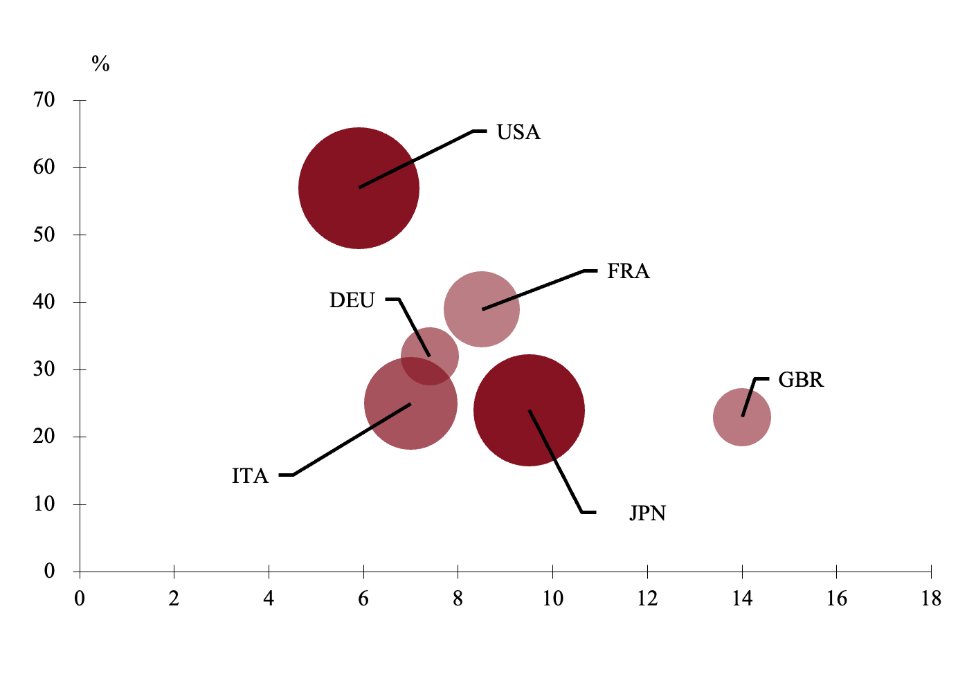 注:x轴为未偿债务平均到期期限(年),y轴为国库券(短期债务)发行量占总借款额的比例(%),泡沫大小为再融资需求占GDP的比重(%)