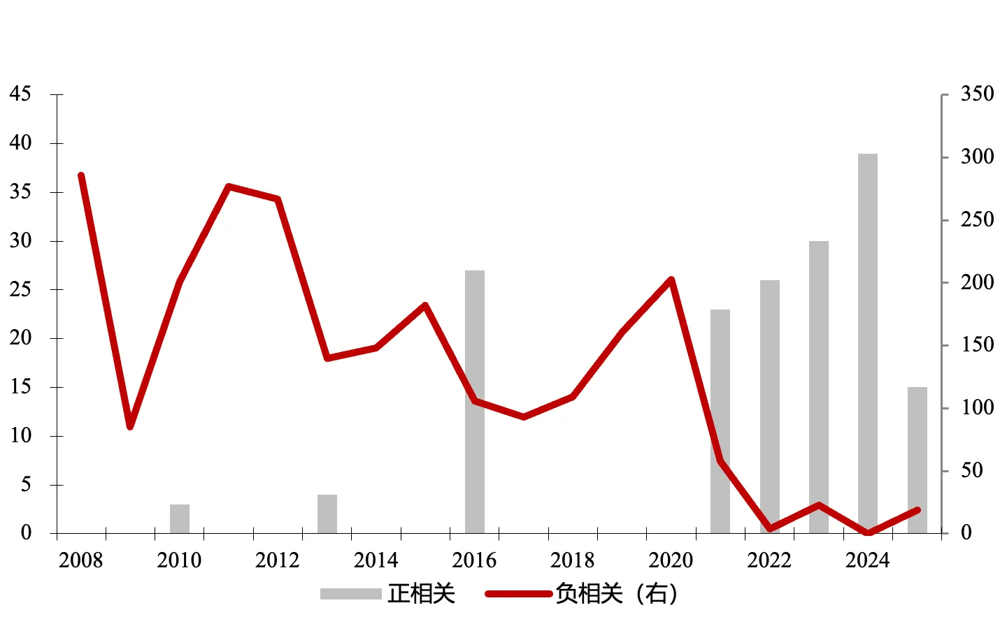 资料来源:Bloomberg以及工银国际计算(以标普500指数代表风险资产,美国10年期国债代表无风险资产。利用1个月的滚动窗口计算风险资产与无风险资产的收益相关性,并统计年内相关性超过0.5(-0.5)的次数,以此衡量正(负)相关性。2025年数据截至11月17日。)