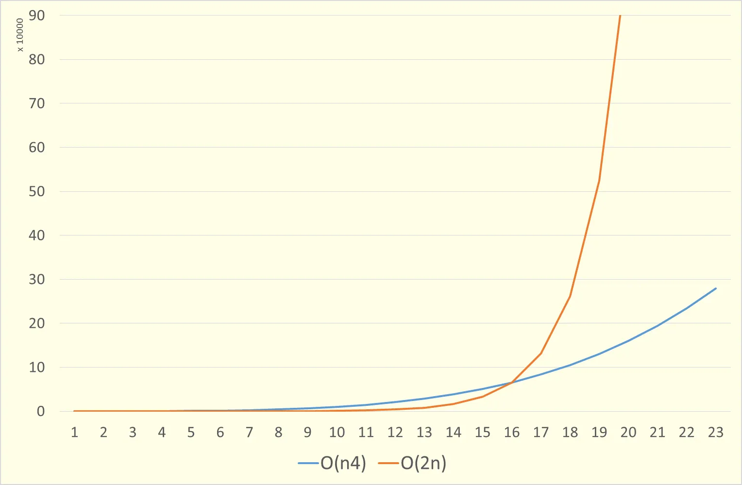 说明:图中,横轴为n,纵轴为n的函数。蓝色曲线代表计算效率的提高(O(n4)),橙色曲线代表二维空间组合数量随着精度提高的增长速度(O(2n))。图中显示,当n > 16后,计算复杂度数量增长就迅速超过计算效率增长。
