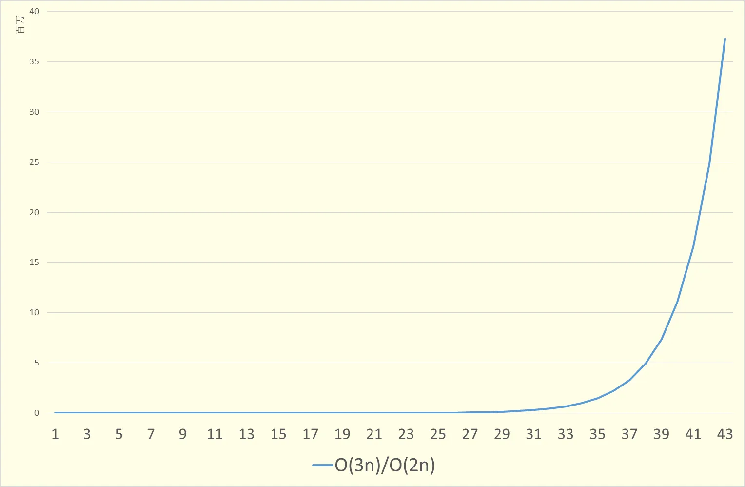 说明:图中蓝色曲线表示三维多项式复杂度与二维多项式复杂度之比(O(3n)/O(2n))。说明增加一个维度,在n较大时,复杂度会增加一个数量级。