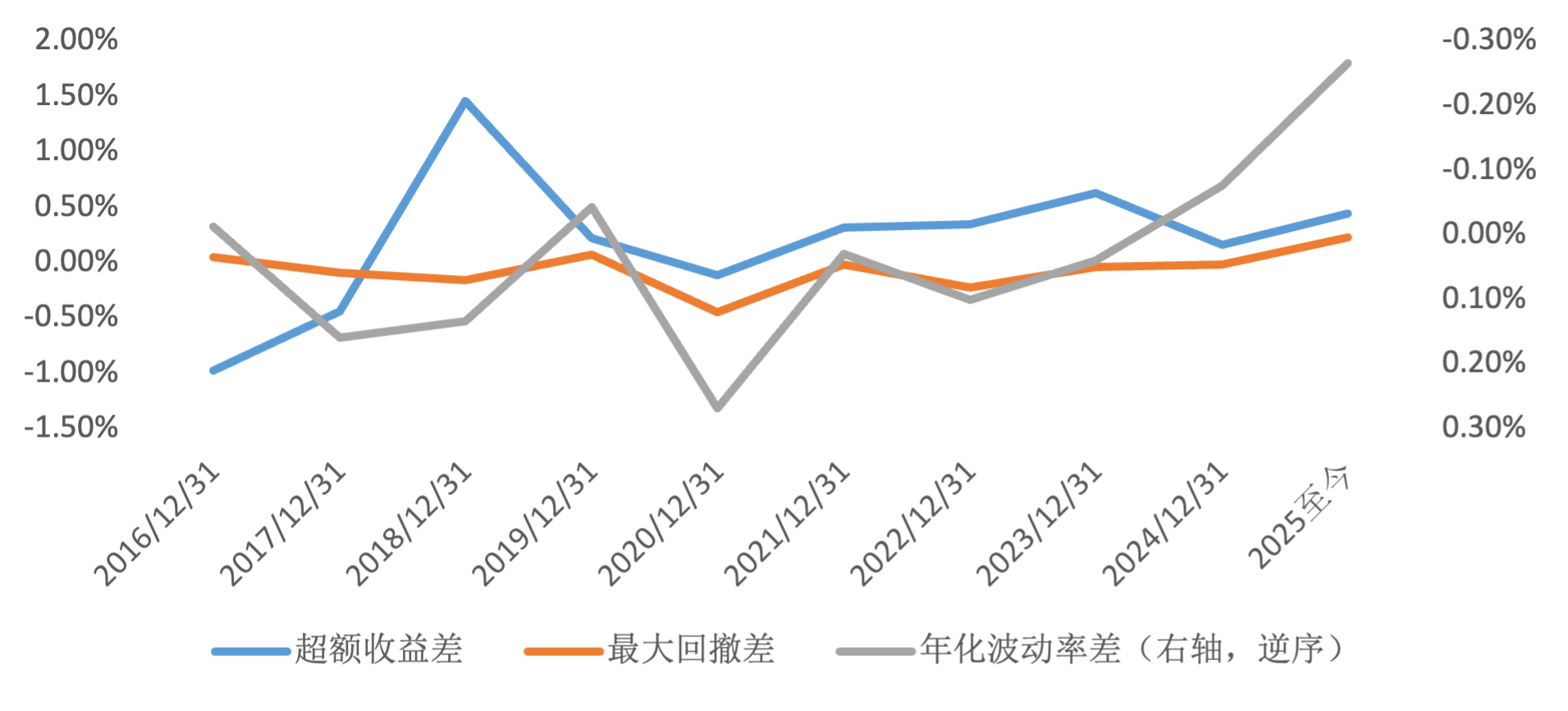债券方面,中国债券可能有阶段性交易机会,但收益率下行空间相对有限,2026年中枢或震荡上移,中短久期债券的投资确定性相对较高。比较万得短期和中长期纯债基金指数分别相对中债新综合(1年以下)、(1-3年)指数的表现,可以发现,进入低息、高波、收益率曲线平坦的环境后长久期债券产品的主动管理效果明显下降(详见附图)。2026年,预计美债收益率曲线牛陡,一方面受到联邦基金目标利率牵引,在降息通道内收益率中枢趋于下移;另一方面,在市场对美国财政可持续性担忧增加、美联储独立性下降、关税和移民政策等逆全球化因素带来通胀中枢上移的影响下,长债利率的下行幅度受到约束。