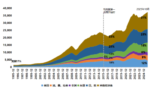 长期而言,在大国博弈延续、地缘冲突频发、经济结构调整等背景下,中国以畅通内循环、多元外循环作为应对之策。一方面,“十五五”规划建议明确“提振消费”与“扩大有效投资”,夯实国内大循环的内生动力,强调从消费供给侧扩容升级,需求侧“统筹促就业、增收入、稳预期”,提高居民消费率;同时民生和安全投资并重,推动科技自立自强与产业链现代化。另一方面,中国积极打造外循环良性生态,通过共建各类多边合作框架,推动出口国别多元化(详见附图),并通过产业结构升级维持出口竞争力。短期来看,国内经济基本面整体稳定,结构上呈现出“供给好于需求,外需强于内需”的特征。笔者在《2025年金融市场运行的六条线索》一文中指出,产业和资本市场政策维持呵护基调,供需再平衡、反内卷政策边际提振了再通胀预期。展望2026年,反内卷政策对供给侧的改革和对价格端的改善仍然是中国经济变化的主线。较之十年前的供给侧改革,本轮反内卷行业更广泛(除了钢铁、水泥、煤炭、建材,还包括汽车、光伏、电商、快递等行业),涉及主体中民企占比更高,措施更为多元(包括缩短账期、限制产能、提高准入标准、提升底价、政府投资带动需求等)。从当前效果看,对价格从生产端逐步向消费端传导有积极、温和的影响,但仍未出现物价普遍修复。究其原因,近期地产价格下行压力重新增大、产能利用率仍处于过去五年最低水平,这形成了对终端有效需求和企业盈利的双重制约,从居民、企业部门融资负增长的事实也可以看出。2026年,预计增量政策会从托底地产销售、出清过剩产能、改善供需格局多方面发力,推动物价渐进回升。叠加基数效应的影响,经济在2026年末到2027年有望走出类通缩叙事。