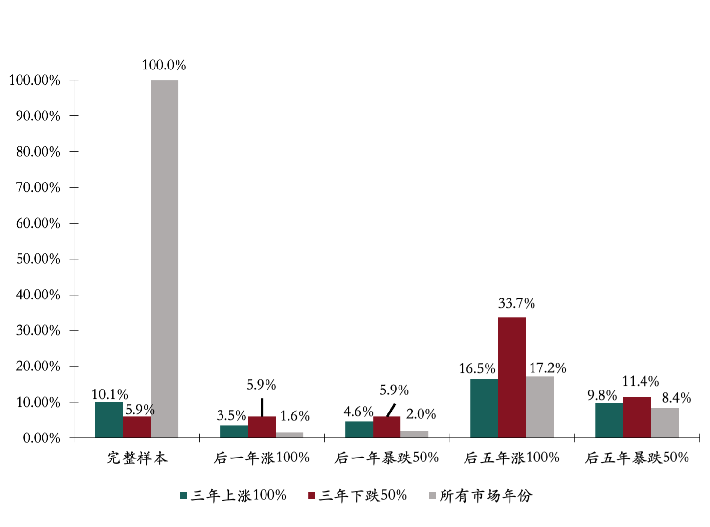 图3:股票市场指数在三个日历年内上涨100%或下跌50%的条件下,市场繁荣和萧条的发生概率