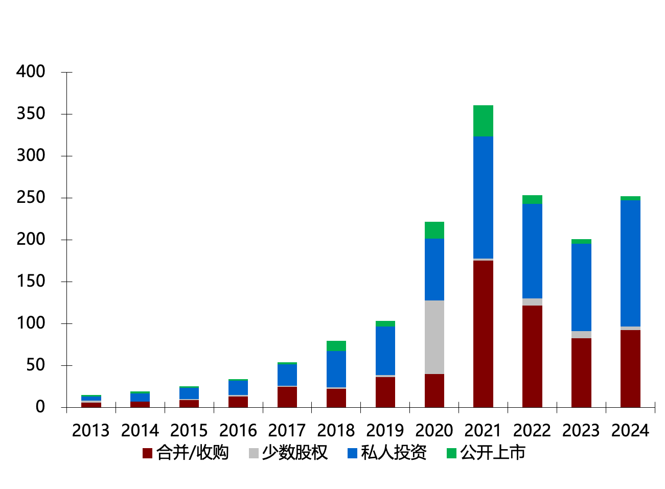图1:2013-2024年按投资活动分类的全球企业对人工智能的投资情况(十亿美元)
