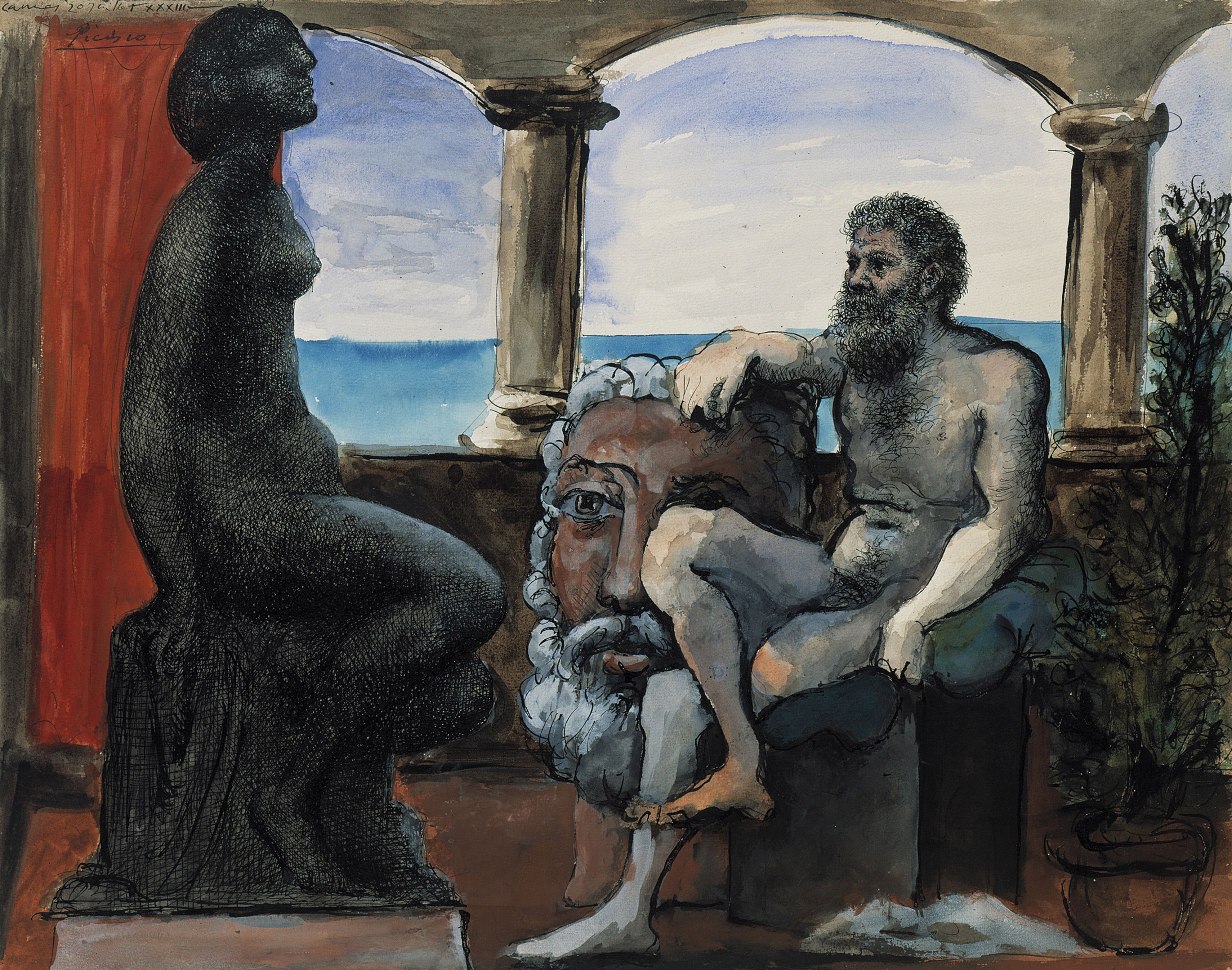 Pablo Picasso,The Sculptor and the Statue Cannes, 20 July 1933 Pen, Indian ink, watercolour, and wash on white Kraft paper,39.5 × 50 cm,Museum Berggruen, Berlin ©Photo Scala, Florence/bpk, Bildagentur fuer Kunst, Kultur und Geschichte, Berlin. Photo: Jens Ziehe ©Succession Pablo Picasso, VEGAP, Madrid,2025