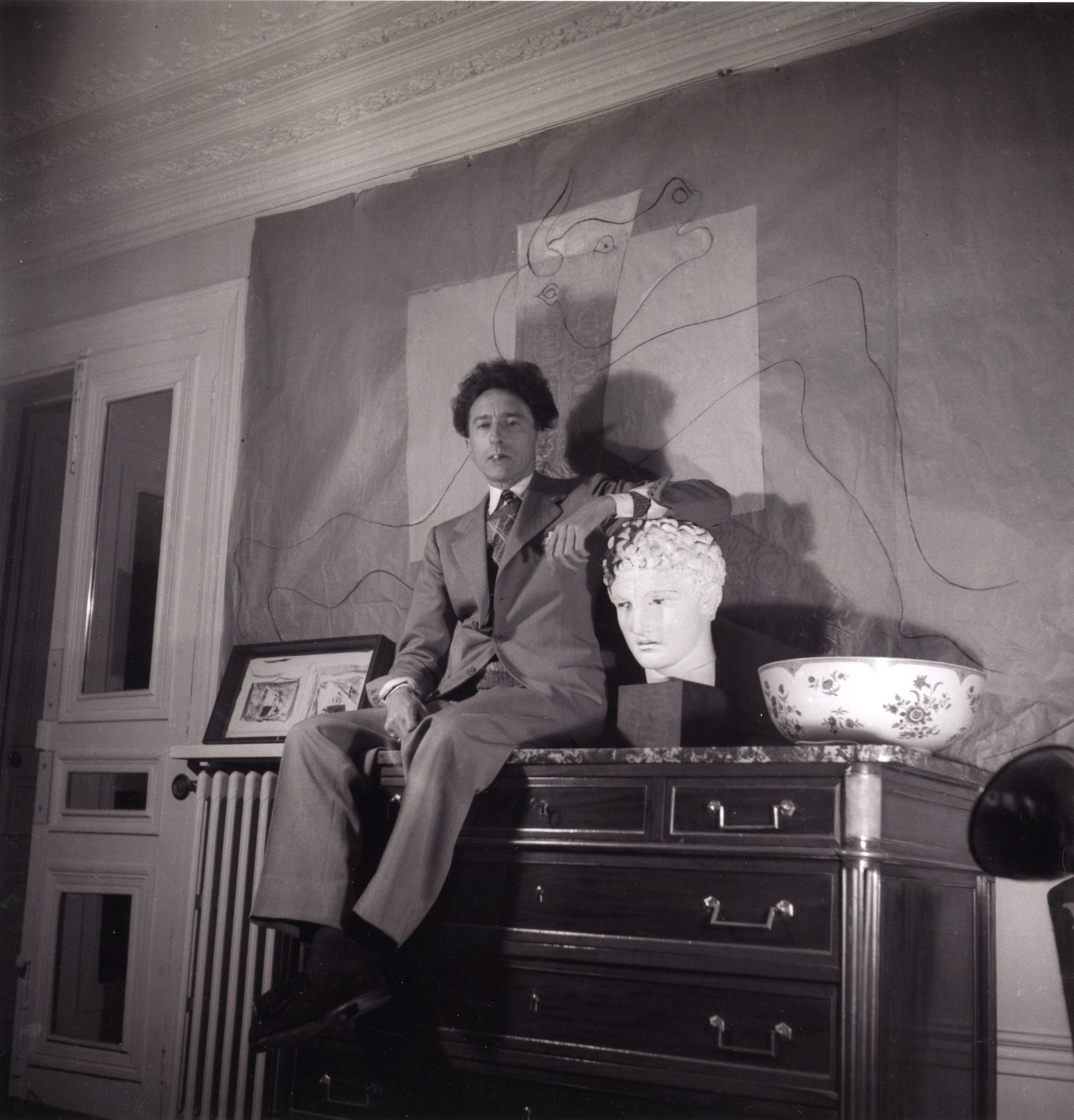 Serge Lido (1906-1984) ,Jean Cocteau in his apartment on Rue d’Anjou Paris, 1938 Modern print 17 x 17 cm ©Collection Ioannis Kontaxopoulos & Alexander Prokopchuk,© Jean Cocteau, VEGAP, Málaga, 2025 ©Succession Pablo Picasso, VEGAP, Madrid, 2025