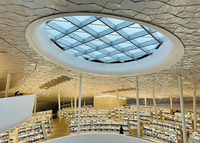 Ithra里的图书馆 摄影:薛莉演出邀请方沙特阿卜杜勒阿齐兹国王世界文化中心(以下简称为Ithra)为沙特阿美石油公司出资建立。Ithra,阿拉伯语意为“丰富”,由世界著名建筑设计事务所Snøhetta设计。这是一座雄心勃勃的综合建筑体,内有剧院、图书馆、博物馆、档案馆等。尤其是面积恢宏的图书馆,藏书20万本,向民众免费开放。