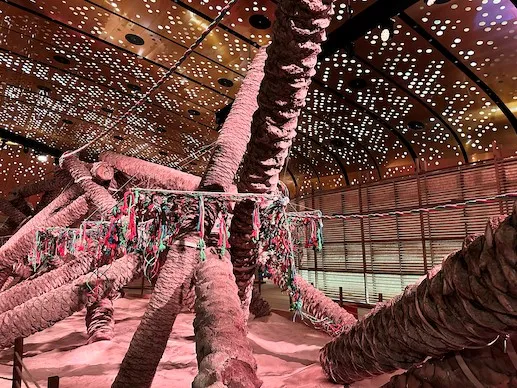 “Eternal Crafts”(永恒的工艺)展览现场,Ithra博物馆 摄影:薛莉而在Ithra博物馆,有5个展览正在展出,当代艺术展“Eternal Crafts”(永恒的工艺)以沙特标志性植物棕榈树为主题和原材料,棕榈树在艺术家眼中不仅仅是一种材料,而是一种生态系统:常青、母性,并且持久,从树干到枝叶,它们被编织、旋转、拼贴,成为天马行空的艺术品;“Horizon in Their Hands——Women Artists from the Arab World(1960-1980)”汇集了阿拉伯世界70多位女性艺术家的创作。长期以来,阿拉伯世界女艺术家的贡献未被纳入艺术史,这个展览对于女性艺术家在艺术史中的存在与意义有着超乎寻常的意义;而“Echoes of the Familiar”(熟悉的回声),则通过对家庭物品的回顾,营造了一场集体怀旧。从老式电视机天线到卡带机器,不仅激发了当地观众的情感共鸣,甚至连我们这些从中国远道而来的参观者都感受到了文化共振。