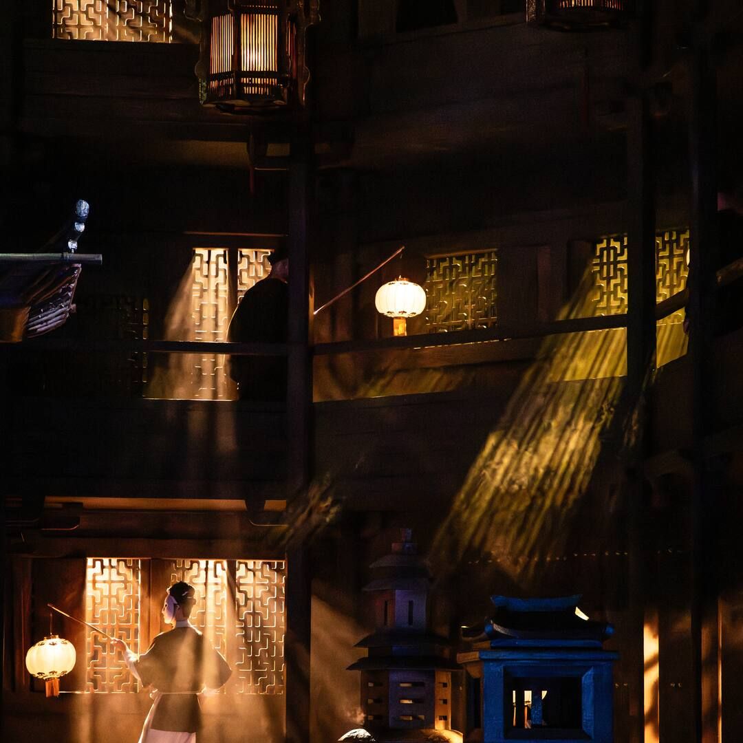 观众看到,只有在第二幕独处回忆故乡的段落时,“平”、“庞”、“彭”才短暂显露真实的内心世界。随着一幅巨大的山水画卷缓缓展开,张小猛唱起了竹林遍地、湖蓝树绿的家乡。他说,第一次唱到“Honan”的歌词时,还以为指的是河南,后来意识到,河南并无大量竹子,应该是湖南更贴切。而另一位臣子唱到的浙江,则恰好是他的家乡。这种拼贴式的地名与意象,并非精确指认,而是普契尼对中国的模糊认知在舞台上的延伸。“这部作品本身就是一个神话,”张小猛说,“它并不是真正的中国,而是一个被想象出来的古代王朝。”