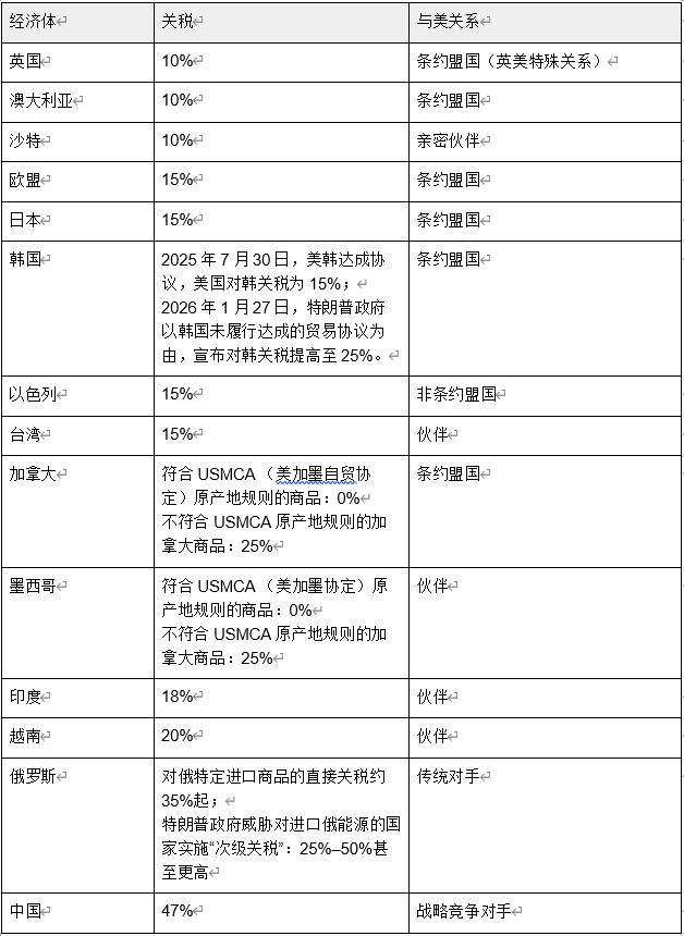 特朗普偏爱关税这个经济手段,将其用于实现几乎一切目标。2025年4月2日,特朗普政府宣布对世界各国征收所谓“对等关税”(Reciprocal Tariff),不仅对手中招,盟友、伙伴也未能幸免。人们普遍认为,特朗普政府只讲利益不讲友谊,对全世界发起了无差别攻击。但情况并非如此简单,经过大半年谈判,美国对各国关税现已尘埃落定,下表是美国对各代表性经济体所征收关税的最新情况(截至2026年2月11日):