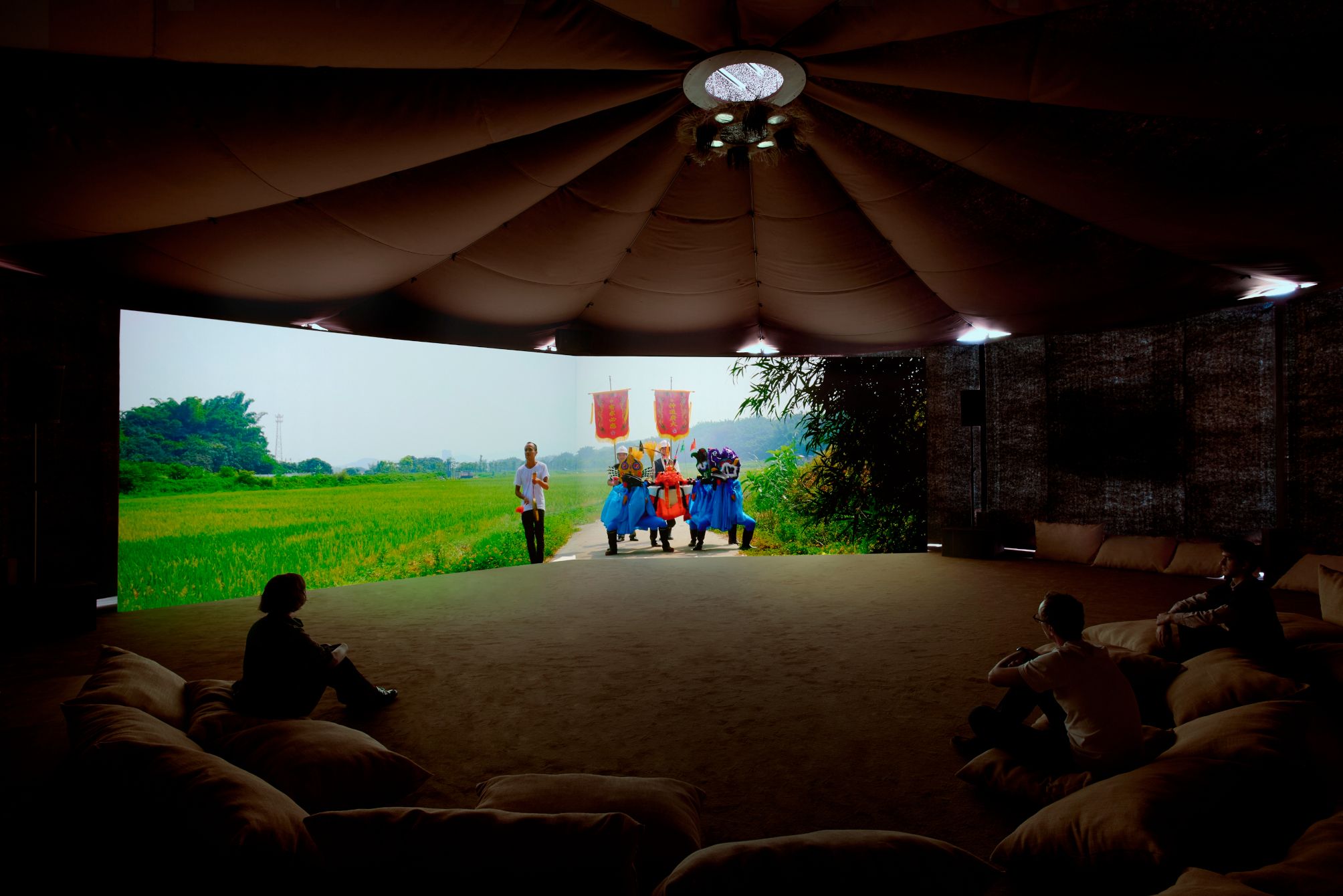 曹斐,“超级农场”(DASH)展览现场,图片致谢:Fondazione Prada“展览中其实隐藏着一座庙宇,”曹斐说道,“我起初是在处理一个高科技项目,最后却回到了对土地、神明与祖先的敬畏。”她回溯神农氏发明工具的远古叙事,发现农业最初始的动力皆源于信仰,为了与神灵沟通以祈求风调雨顺。《超级农场》试图重新连接这段断裂的传统,影片中那场在田间举行的仪式表演,便是她身为艺术家所虚构的一场当代祭典。