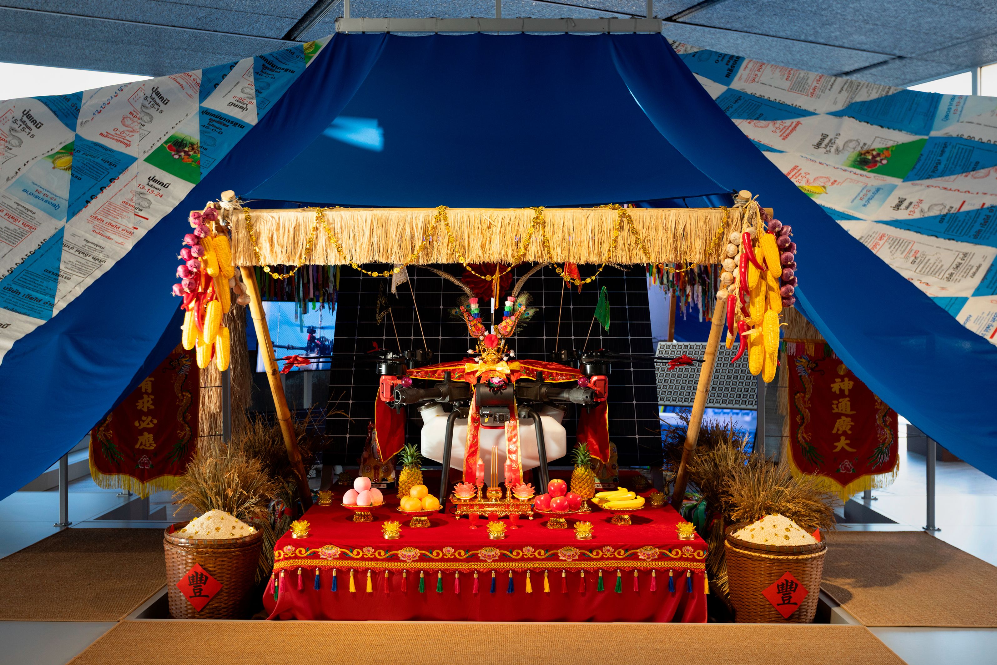 若说标题的英文措辞充满了引擎的脉动,其中文译名“云耜”则叠加了深厚的历史座标。“云耜”巧妙地连结了神农在上古时代发明的翻土农具“耒耜”。曹斐解释,当无人机的旋翼叶片摺叠时,其形态与那种“一根棍子加上两个叉子”的原始木耜惊人地相似。通过这种视觉与语义上的重合,工具的演进从泥土深处跃升至高空,“耕作”不再是直接与土地的接触,而是来自天空中的俯视、扫描并获得。