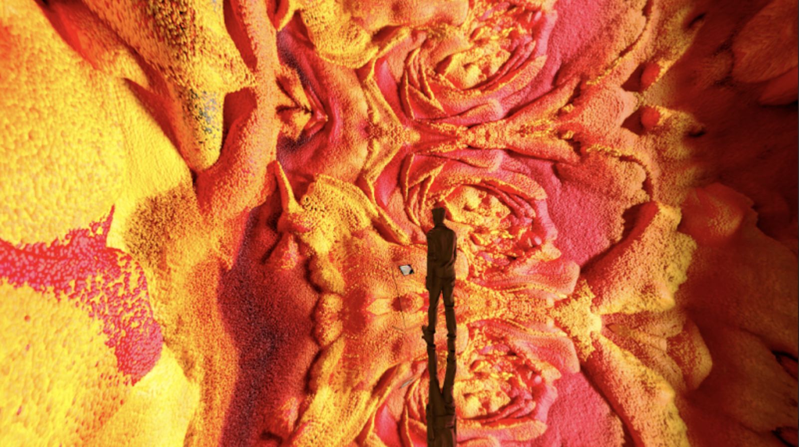 屏幕上,大自然植物般的成像,在翻滚、变形,仿佛海浪奔涌,如梦如幻,当观众步入其中,四周被不断流动的视觉所包围:变化不息的图案、文字与影像,仿佛置身于一个正在思考、呼吸的“意识之中”。